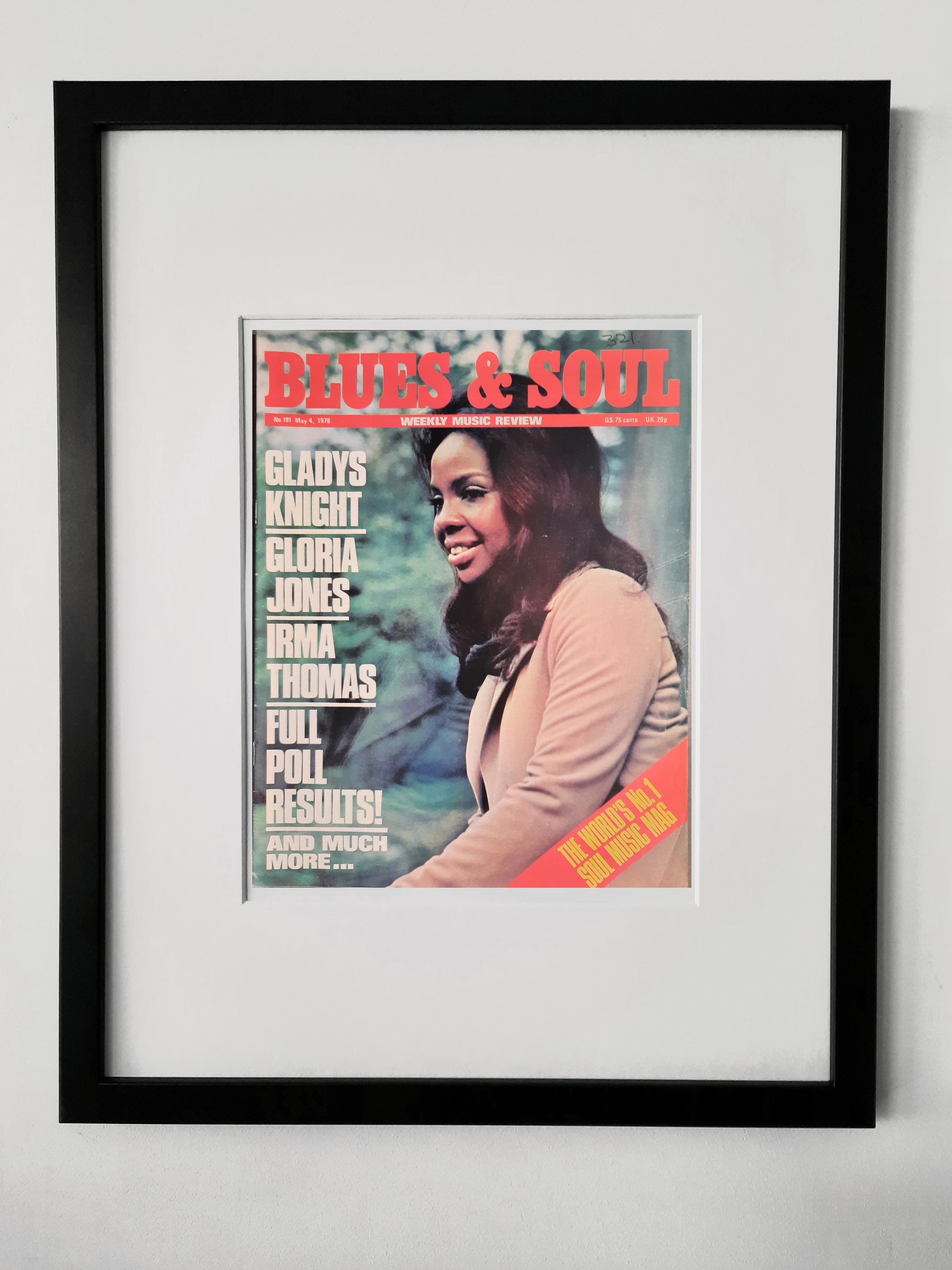 Framed cover from this 1974 edition of Blues and Soul featuring the magnificent Gladys Knight. Please note a bit of writing at the top of the page. 18 x 14 inch frame.