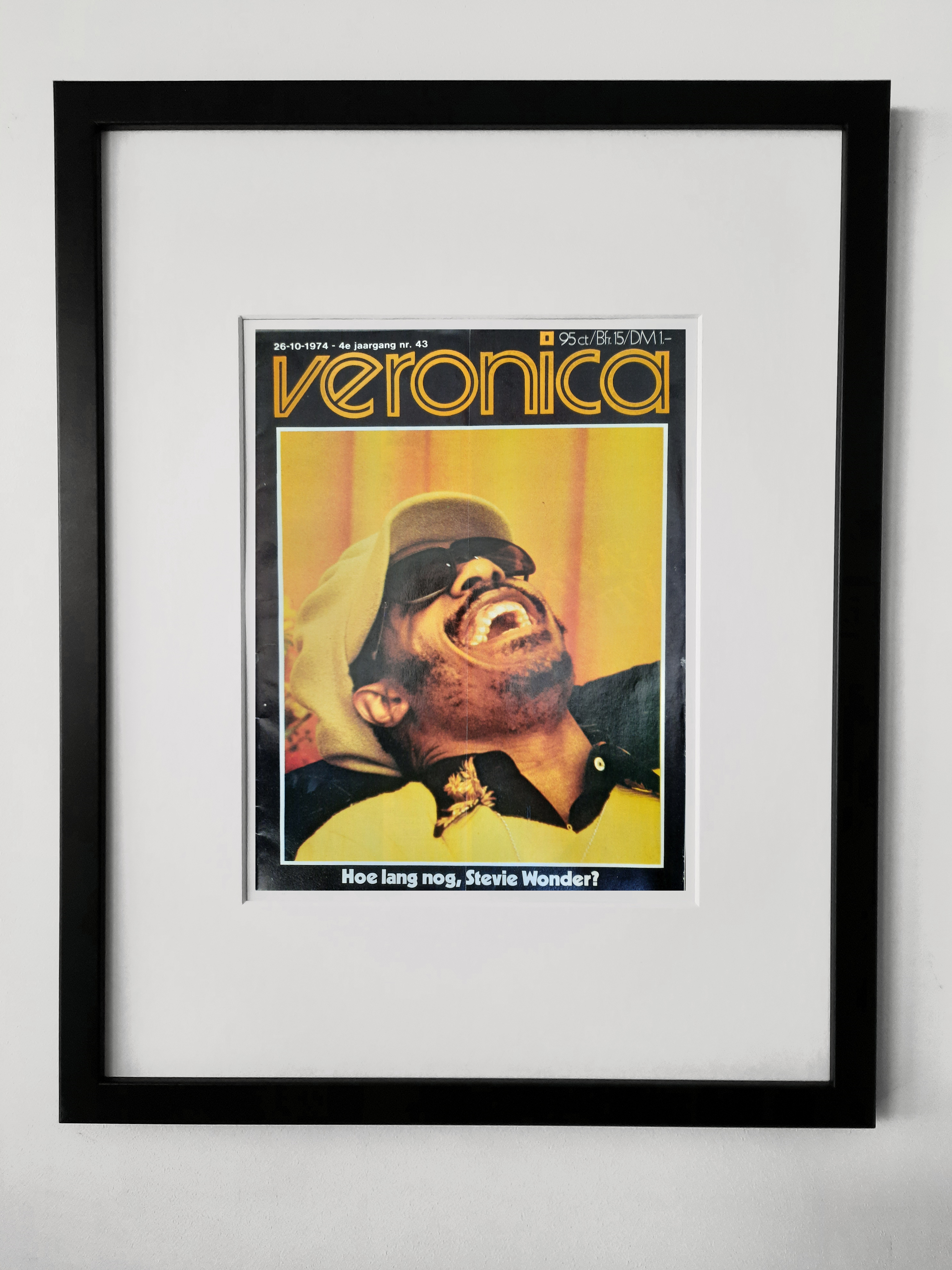 Stevie Wonder laughing as only Stevie Wonder can. 1974 Dutch Veronica radio magazine. 18 x 14 inch frame. By the way, I haven’t framed this yet – I’ve tried to be clever and photoshop the sheet into a blank frame but as my desire exceeds my skill it’s not quite centred – when I actually frame it it will be much better … promise.